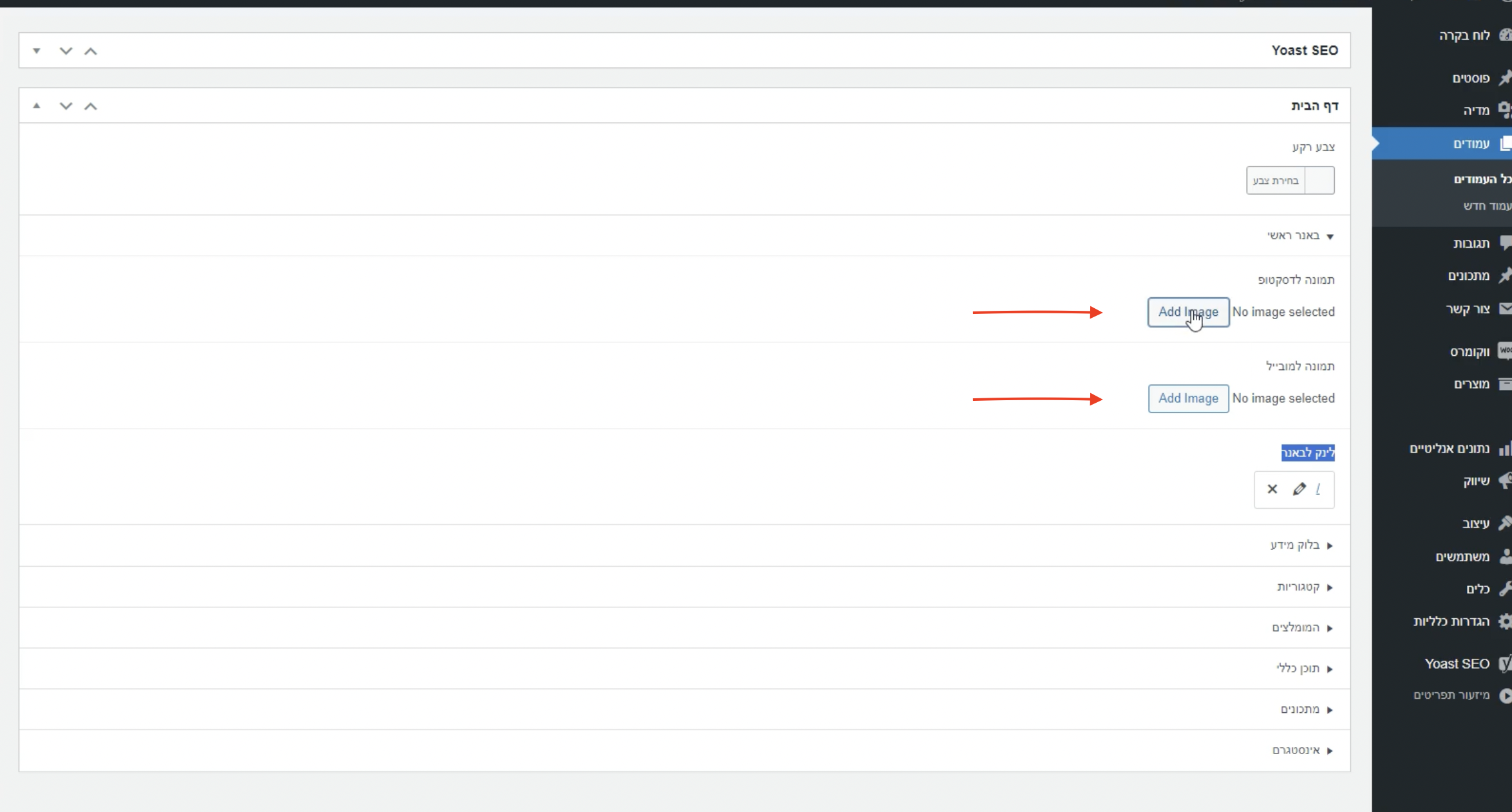אופציה שניה, להיכנס למערכת הניהול, עמודים, ושם לחפש את עמוד הבית ולהיכנס לעריכה. - מוחקים את 2 התמונות שיש שם תחת ״באנר ראשי״, את התמונה לדסקטופ ואת התמונה למובייל.