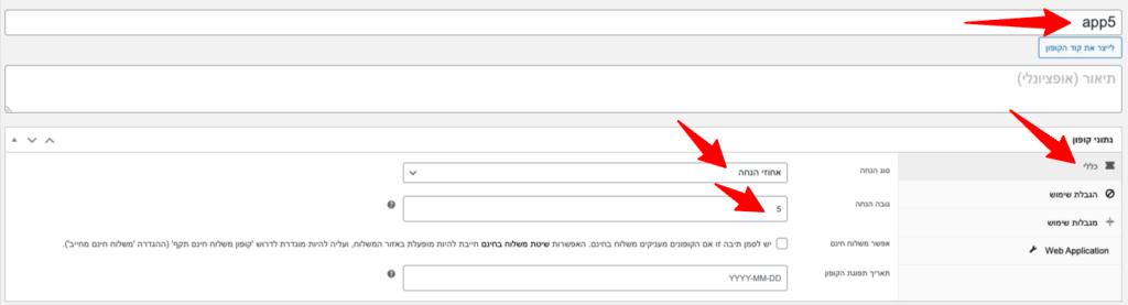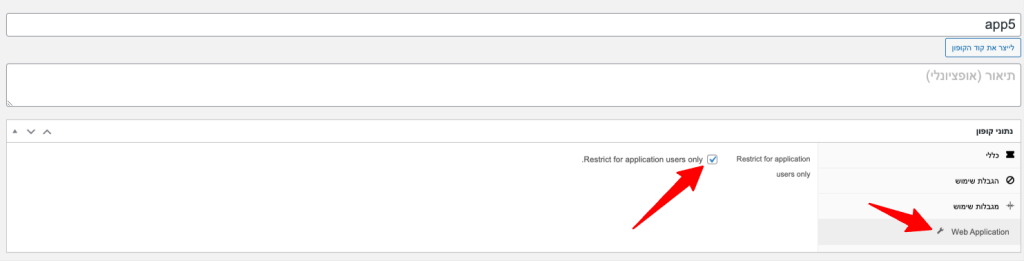 אם יש לכם אפליקציה ותרצו לתת קופון רק למשתמשי האפליקציה, תקימו קוד קופון כמו שאתם רגילים: