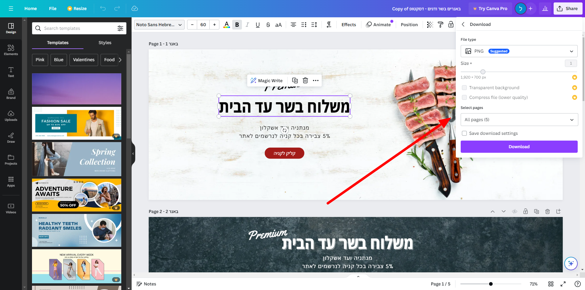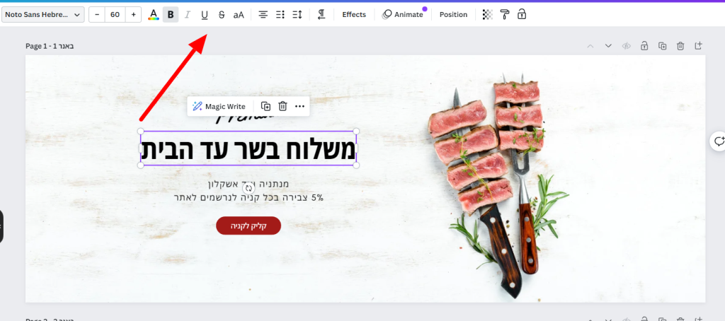 בוחרים את אחד הבאנרים לדוגמא שיש שם ועורכים את הטקסט באמצעות עורכי התוכן שיש בקאנבה (לחיצה על הטקסט תפתח אותו לעריכה)